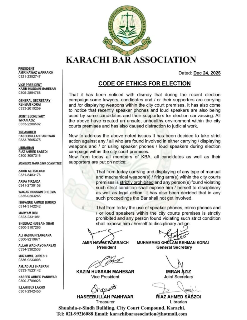 چیف جسٹس سندھ ہائیکورٹ اور کراچی بار کے اراکین کی ملاقات کے بعد وکلاء الیکشن کے ماحول کو پرامن بنانے کے لیے ایک اہم نوٹیفیکیشن جاری کیا گیا ہے