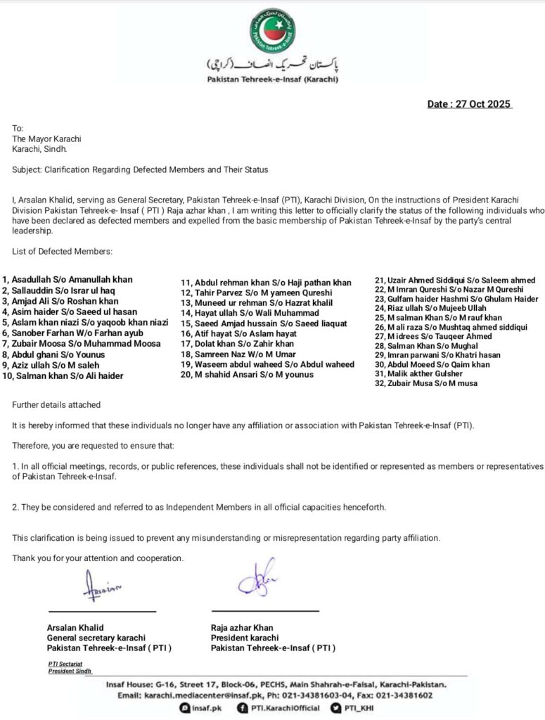 پاکستان تحریک انصاف نے کراچی کے بلدیاتی ڈھانچے سے وابستہ اپنے بتیس چیئرمینوں سے اٹھائیس ماہ بعد باضابطہ طور پر اظہارِ لاتعلقی کر دیا ہے یہ فیصلہ پی ٹی آئی کراچی کی قیادت راجہ اظہر کی جانب سے جاری کردہ ایک سرکاری خط کے ذریعے سامنے آیا جو میئر کراچی مرتضیٰ وہاب کو ارسال کیا گیا خط میں واضح طور پر کہا گیا ہے کہ تمام بتیس افراد سے پاکستان تحریک انصاف کا کوئی تعلق نہیں رہا وہ پارٹی پالیسی سے انحراف کر چکے ہیںلہٰذا انہیں ذاتی حیثیت میں رکن سمجھا جائے خط میں مزید ہدایت کی گئی کہ سرکاری خط و کتابت یا عوامی حلقوں میں ان افراد کا تعلق پاکستان تحریک انصاف سے نہ جوڑا جائے اور سٹی کاؤنسل میں انہیں آزاد ارکان تصور کیا جائے