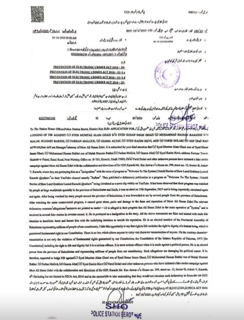 رپورٹ : علی رضا بلوچستان کے ضلع حب میں صوبائی وزیر علی حسن بروہی کے مینیجر علی اصغر زہری کی مدعیت میں صحافی فرحان ملک، اسامہ الطاف، آباد کے چیئرمین حسن بخشی، ریٹائرڈ ایس ایس پی راؤ انوار، سید ممتاز عالم، سید کاظم رضوی، فرید ڈلاری اور دیگر کے خلاف پیکا ایکٹ کے تحت مقدمہ […]